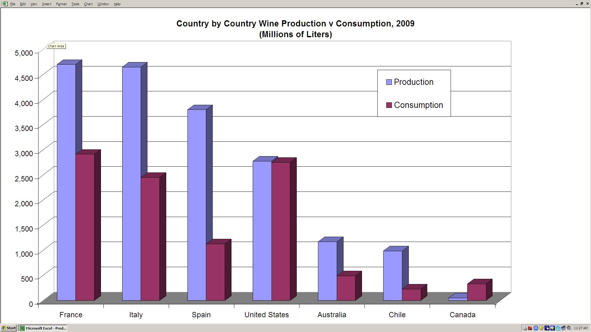 The first thing you should notice is that in order to see Canada (the far right bars) the scale should be changed (ie: we are a tiny blip).  The next thing  you should notice is that Canada is the only country on this graph that shows an industry that produces far less than it consumes– 50,000,000 liters production  versus 334,000,000 liters consumption.  The United States is flat with respect to production and consumption although it exports and imports a great deal.